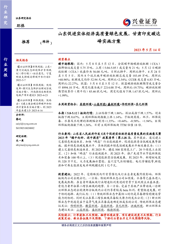 【兴业证券】【20230514】环保行业周报:山东促进实体经济高质量绿色发展,甘肃印发碳达峰实施方案-11页