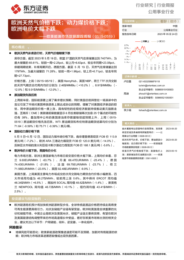 【东方证券】【20230524】欧美能源市场数据跟踪周报:欧洲天然气价格下跌;动力煤价格下跌;欧洲电价大幅下跌-14页
