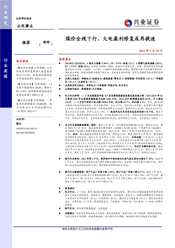 【兴业证券】【20230528】煤价全线下行,火电盈利修复或再提速-22页