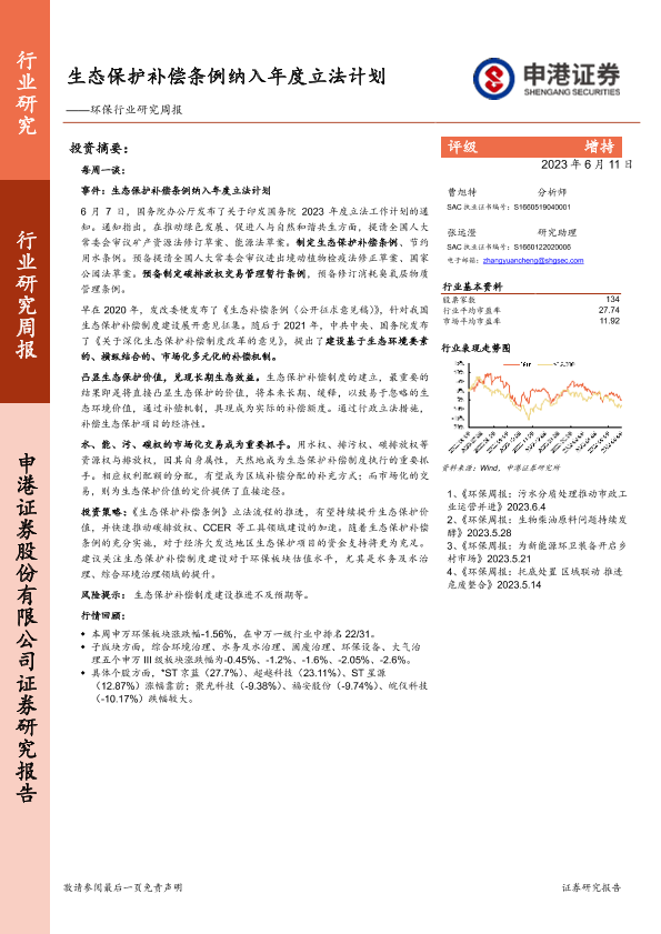 【申港证券】【20230611】环保行业研究周报:生态保护补偿条例纳入年度立法计划-10页