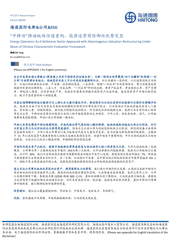 【海通国际】【20230614】电新&公用&ESG:“中特估”推动板块估值重构,能源运营商防御性优势突显-13页