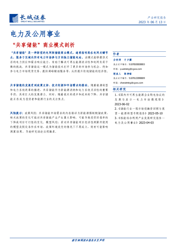 【长城证券】【20230613】电力及公用事业:“共享储能”商业模式剖析-17页