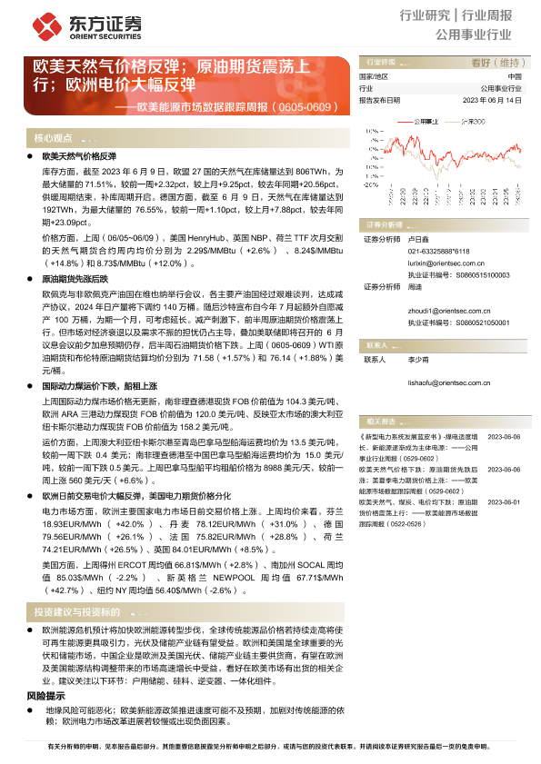 【东方证券】【20230614】欧美能源市场数据跟踪周报:欧美天然气价格反弹;原油期货震荡上行;欧洲电价大幅反弹-13页