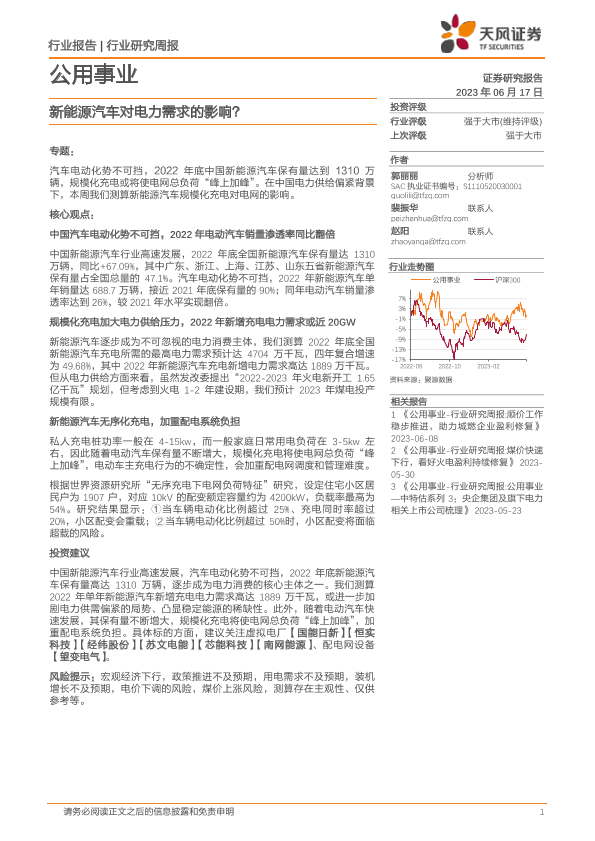 【天风证券】【20230617】公用事业行业研究周报:新能源汽车对电力需求的影响-14页