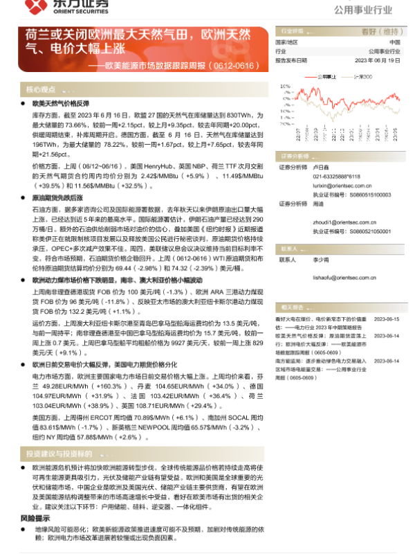 【东方证券】【20230619】欧美能源市场数据跟踪周报:荷兰或关闭欧洲最大天然气田,欧洲天然气、电价大幅上涨-13页