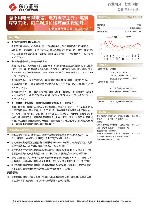 【东方证券】【20230628】公用事业行业周报:夏季用电高峰来临,电力需求上升,煤炭库存去化,港口现货价格方面企稳回升-17页