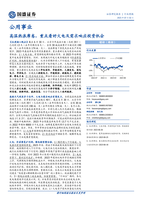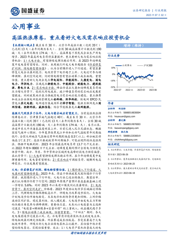 【国盛证券】【20230702】公用事业行业周报:高温热浪席卷,重点看好火电及需求响应投资机会-12页