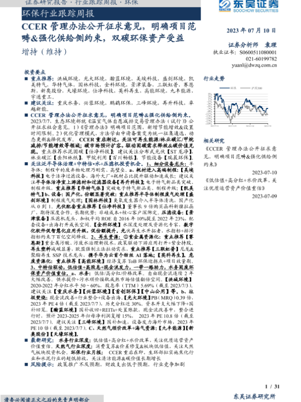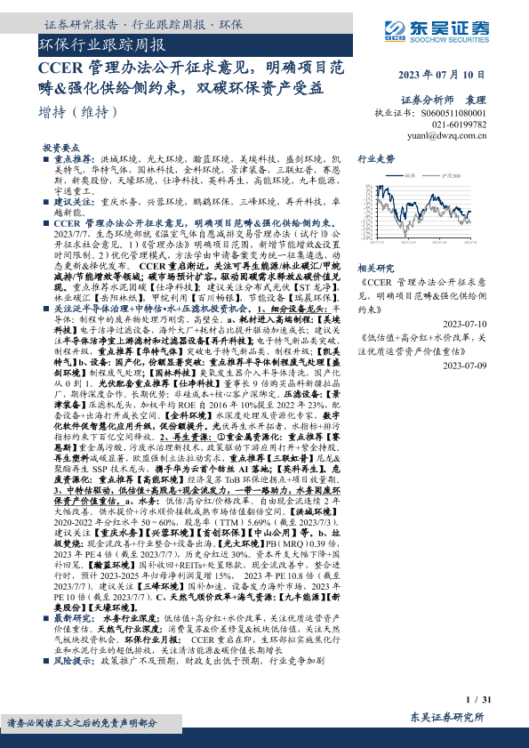 【东吴证券】【20230710】环保行业跟踪周报:CCER管理办法公开征求意见,明确项目范畴&强化供给侧约束,双碳环保资产受益-31页