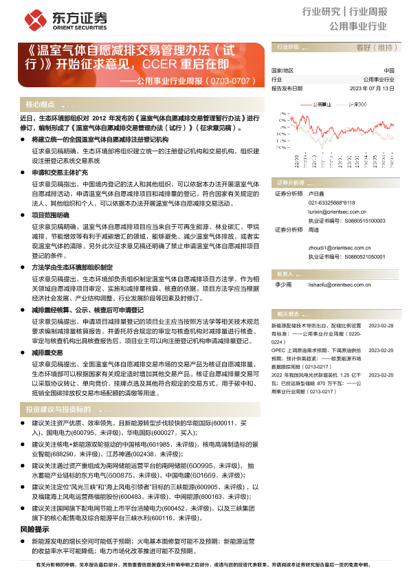 【东方证券】【20230713】公用事业行业周报:《温室气体自愿减排交易管理办法(试行)》开始征求意见,CCER重启在即-19页