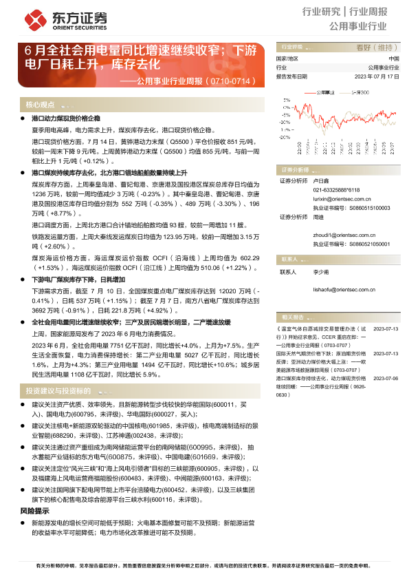 【东方证券】【20230717】公用事业行业周报:6月全社会用电量同比增速继续收窄;下游电厂日耗上升,库存去化-22页