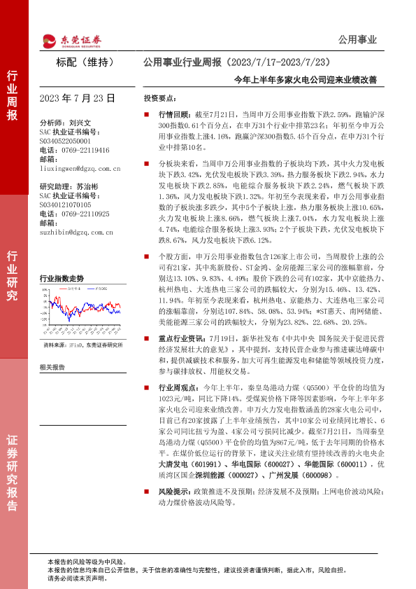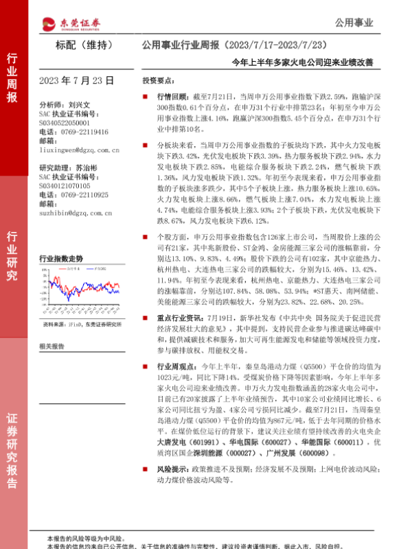 【东莞证券】【20230723】公用事业行业周报:今年上半年多家火电公司迎来业绩改善-11页