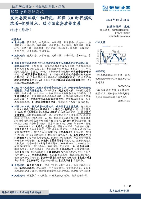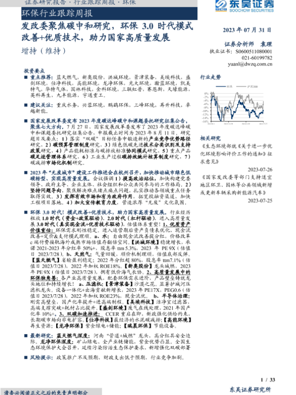 【东吴证券】【20230731】环保行业跟踪周报:发改委聚焦碳中和研究,环保3.0时代模式改善+优质技术,助力国家高质量发展-33页