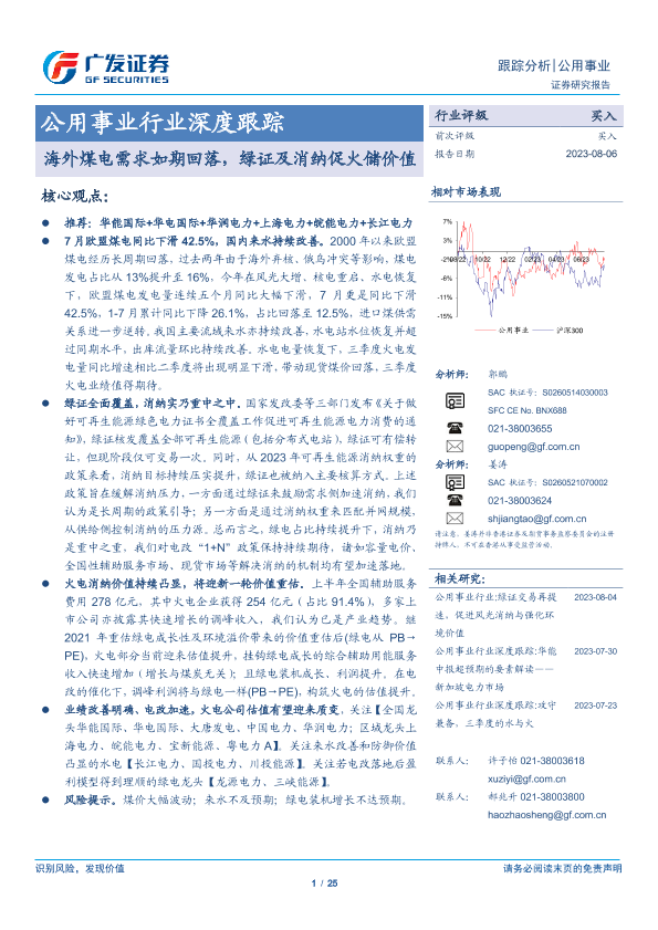 【广发证券】【20230806】公用事业行业深度跟踪:海外煤电需求如期回落,绿证及消纳促火储价值-25页