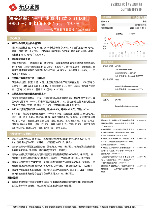 【东方证券】【20230814】公用事业行业周报:海关总署:1~7月我国进口煤2.61亿吨,+88.6%;吨均价838.1元,-19.7%-17页