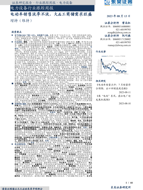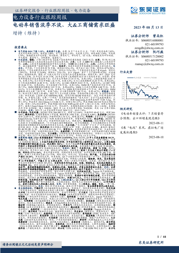 【东吴证券】【20230813】电力设备行业跟踪周报:电动车销售淡季不淡、大&工商储需求旺盛-44页