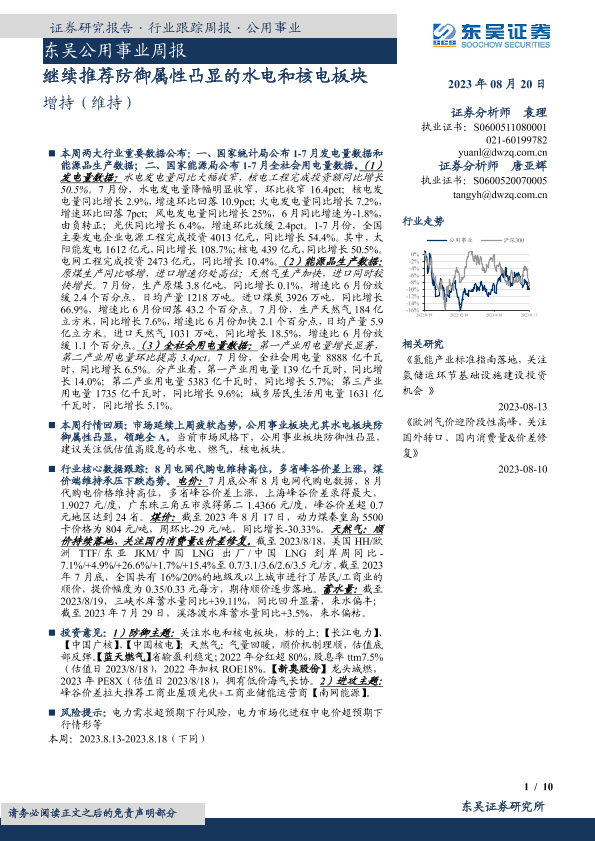 【东吴证券】【20230820】东吴公用事业周报:继续推荐防御属性凸显的水电和核电板块-10页