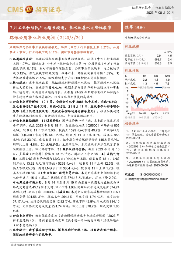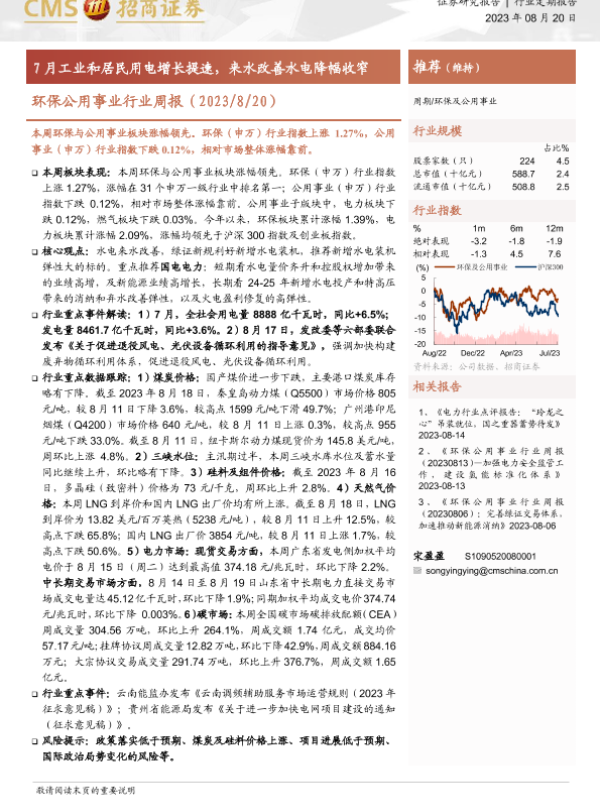 水电改善 煤炭价格 环保公用事业 用电量增长 电力市场