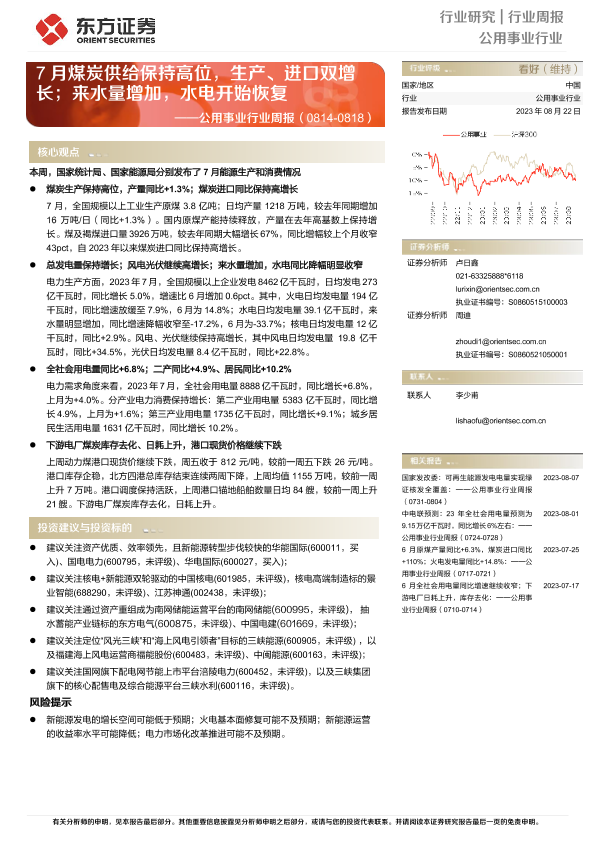 【东方证券】【20230822】7月煤炭供给保持高位,生产、进口双增长;来水量增加,水电开始恢复-19页