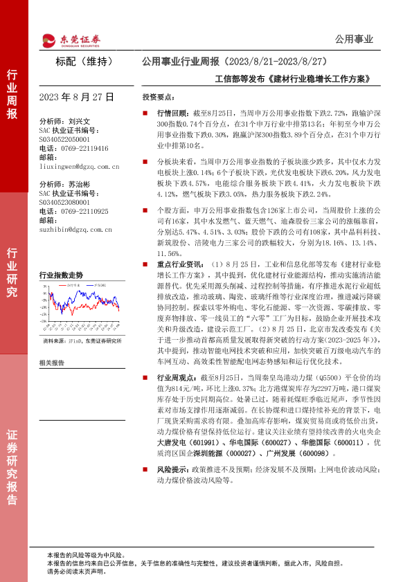 【东莞证券】【20230827】公用事业行业周报:工信部等发布《建材行业稳增长工作方案》-11页