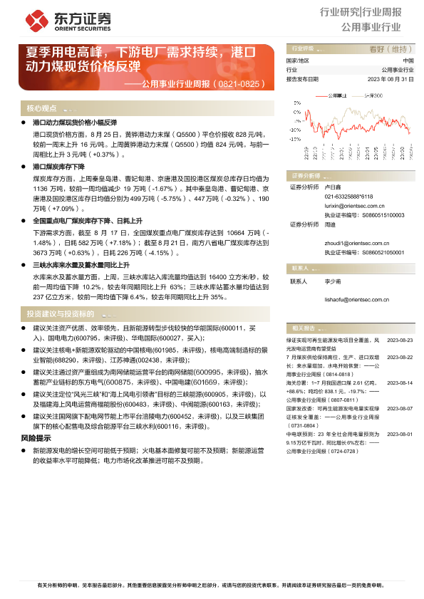 【东方证券】【20230831】公用事业行业周报:夏季用电高峰,下游电厂需求持续,港口动力煤现货价格反弹-19页