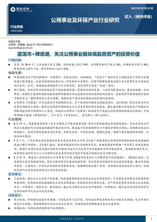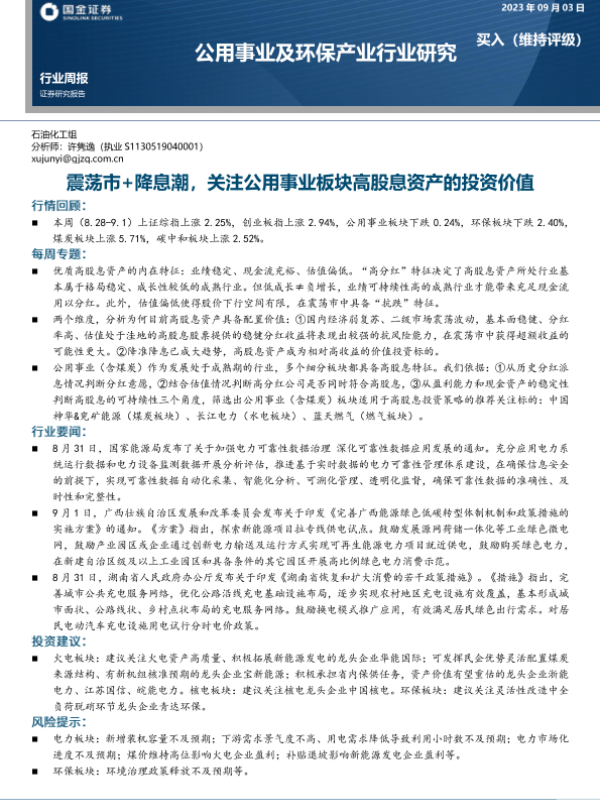 【国金证券】【20230903】公用事业及环保产业行业研究:震荡市+降息潮,关注公用事业板块高股息资产的投资价值-17页