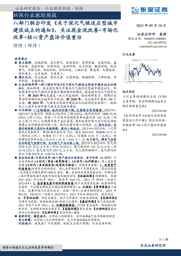 【东吴证券】【20230910】环保行业跟踪周报:八部门联合印发《关于深化气候适应型城市建设试点的通知》,关注现金流改善+市场化改革+核心资产盘活价值重估-33页