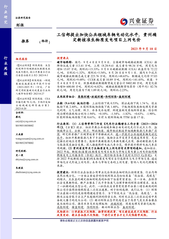 【兴业证券】【20230910】工信部提出加快公共领域车辆电动化水平,贵州确定新核准生物质发电项目上网电价-10页