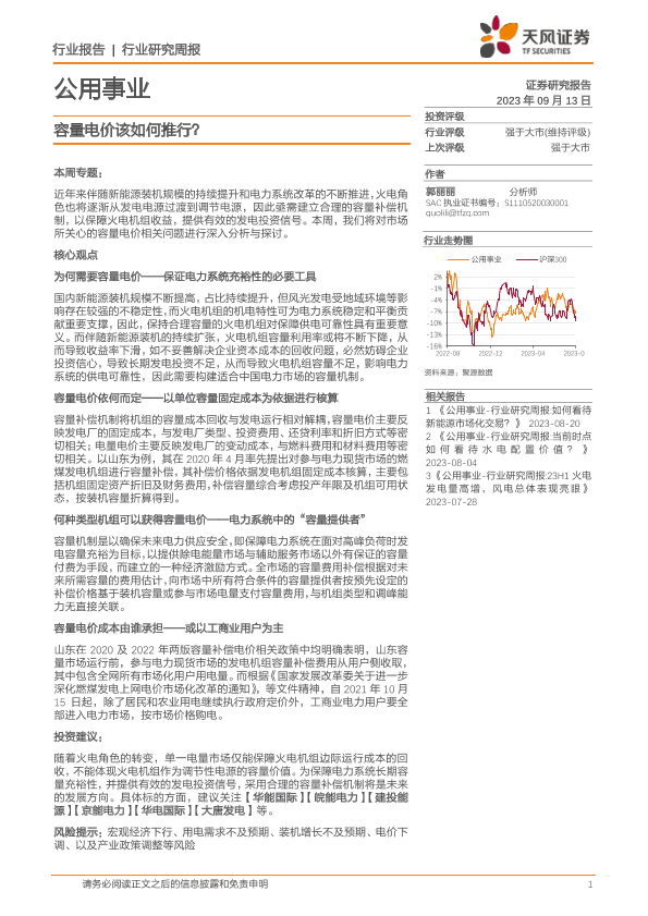 【天风证券】【20230913】公用事业行业研究周报:容量电价该如何推行?-15页
