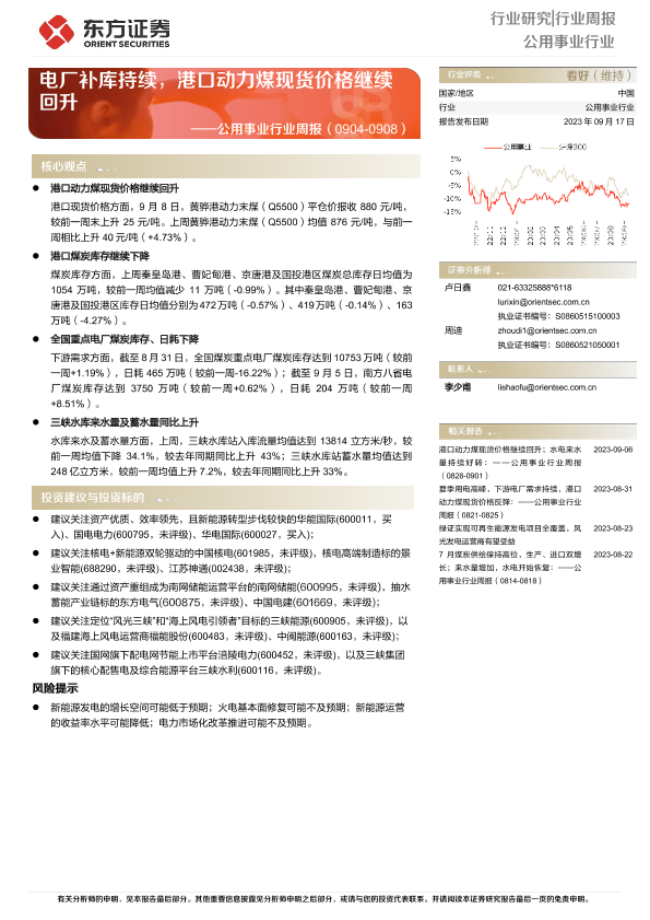 【东方证券】【20230917】公用事业行业周报:电厂补库持续,港口动力煤现货价格继续回升-16页