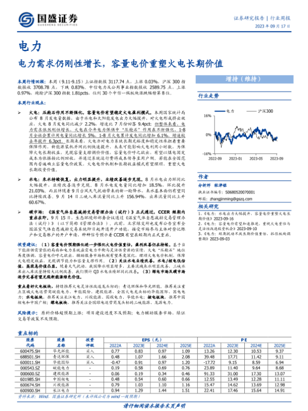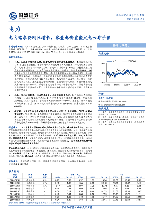 【国盛证券】【20230917】电力行业周报:电力需求仍刚性增长,容量电价重塑火电长期价值-12页