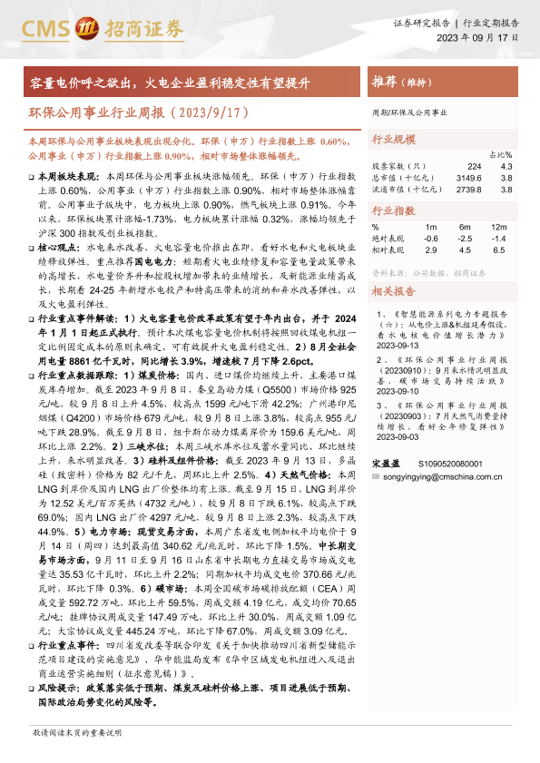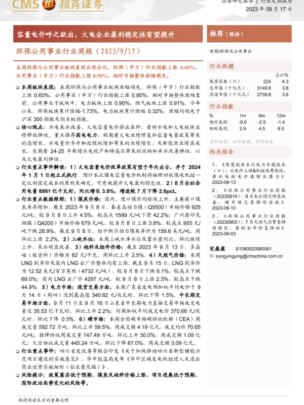 【海通证券】【20230917】环保公用事业行业周报:容量电价呼之欲出,火电企业盈利稳定性有望提升-17页