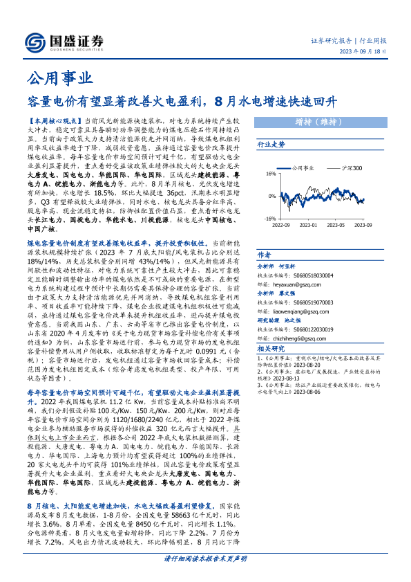 【国盛证券】【20230918】公用事业行业周报:容量电价有望显著改善火电盈利,8月水电增速快速回升-13页