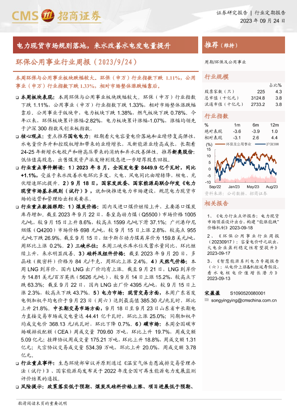 【海通证券】【20230924】环保公用事业行业周报:电力现货市场规则落地,来水改善水电发电量提升-18页