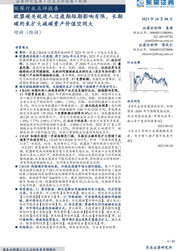 【东吴证券】【20231008】环保行业点评报告:欧盟碳关税进入过渡期短期影响有限,长期碳约束扩大减碳资产价值空间大-12页