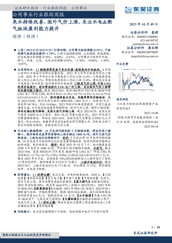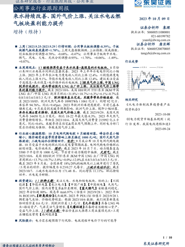 【东吴证券】【20231009】公用事业行业跟踪周报:来水持续改善、国外气价上涨,关注水电&燃气板块盈利能力提升-10页