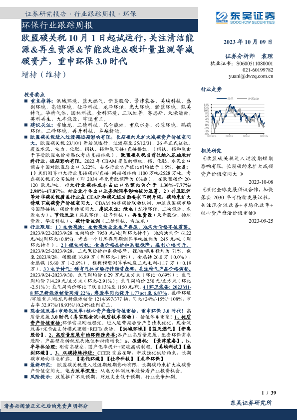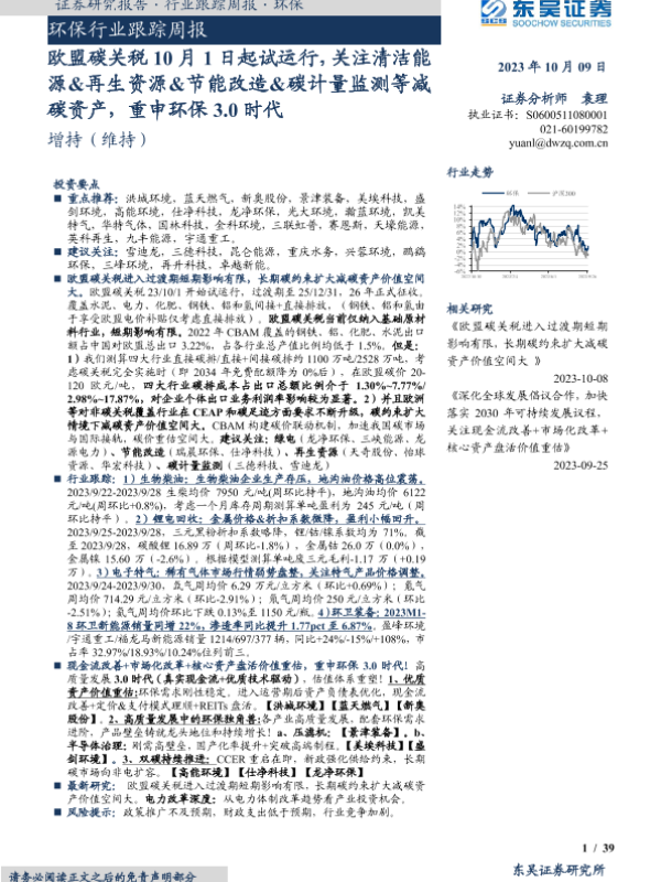 【东吴证券】【20231009】环保行业跟踪周报:欧盟碳关税10月1日起试运行,关注清洁能源&再生资源&节能改造&碳计量监测等减碳资产,重申环保3.0时代-39页