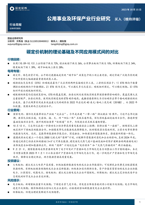 【国金证券】【20231015】公用事业及环保产业行业周报:碳定价机制的理论基础及不同应用模式间的对比-18页