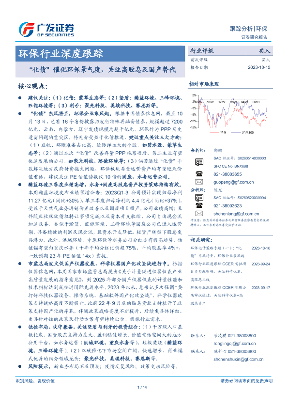 【广发证券】【20231015】环保行业深度跟踪:‘化债’催化环保景气度,关注高股息及国产替代-14页