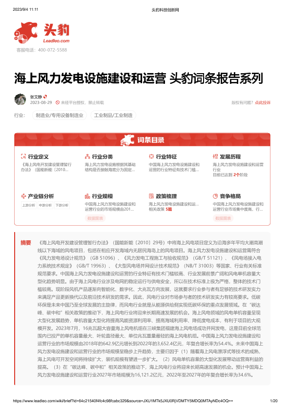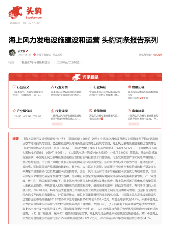 【头豹研究院】【20231016】海上风力发电设施建设和运营-20页