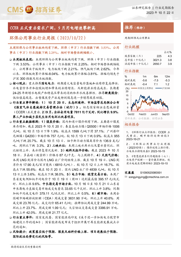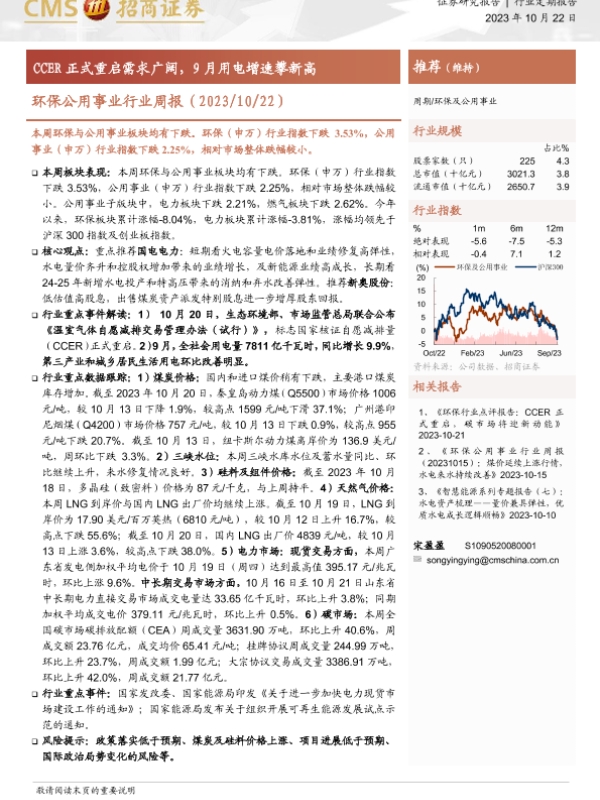 【海通证券】【20231022】环保公用事业行业周报:CCER正式重启需求广阔,9月用电增速攀新高-21页