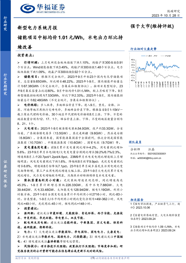 【华福证券】【20231028】新型电力系统月报:储能项目中标均价1.01元 Wh,水电出力环比持续改善-18页
