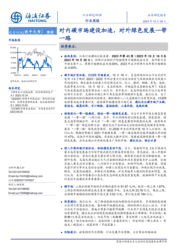 【海通证券】【20231024】环保行业周报:对内碳市场建设加速,对外绿色发展一带一路-14页