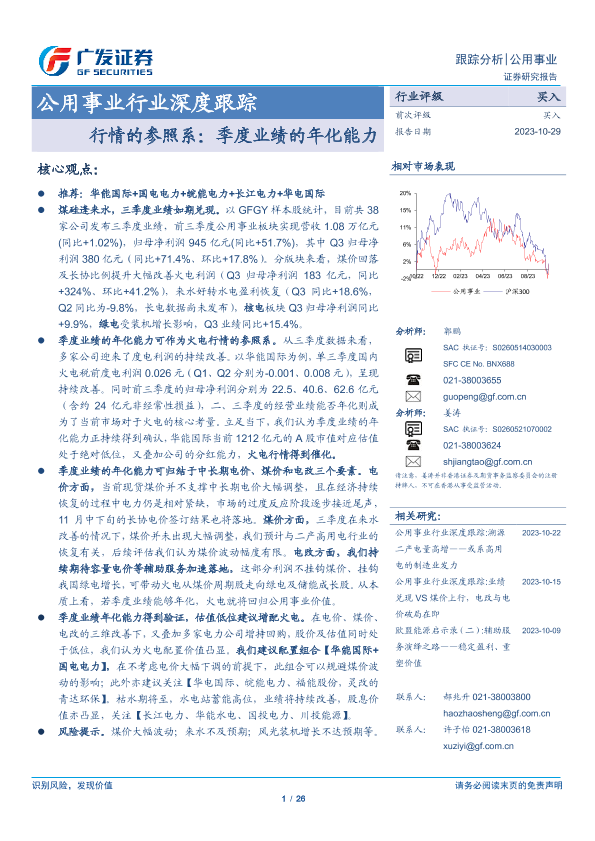 【广发证券】【20231029】公用事业行业深度跟踪:行情的参照系:季度业绩的年化能力-26页