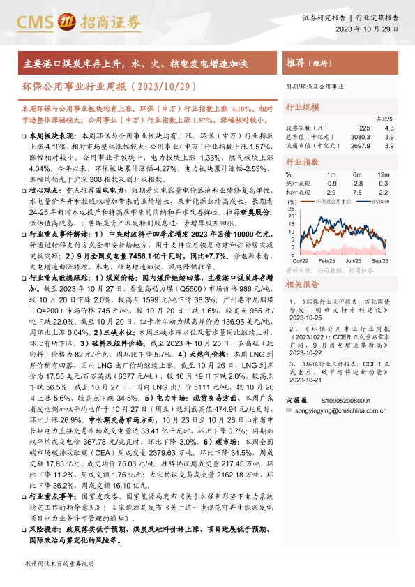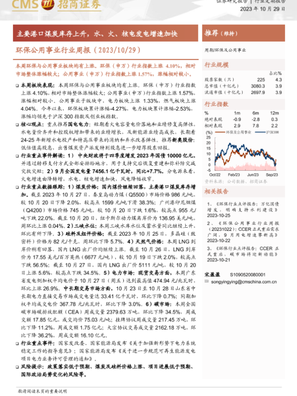 【海通证券】【20231029】环保公用事业行业周报:主要港口煤炭库存上升,水、火、核电发电增速加快-29页