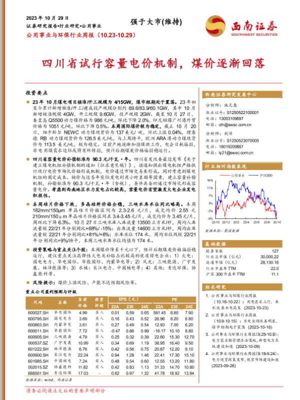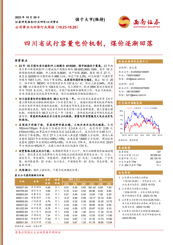 【西南证券】【20231029】公用事业与环保行业周报:四川省试行容量电价机制,煤价逐渐回落-19页