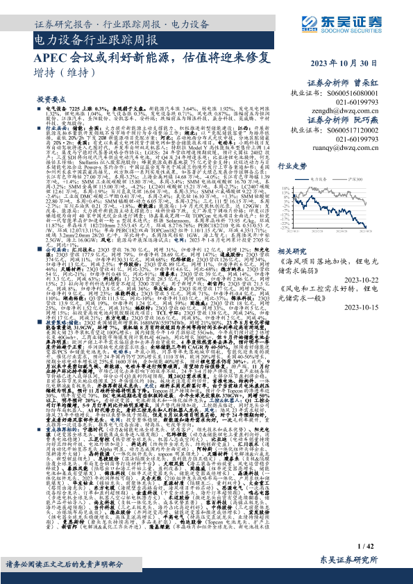 【东吴证券】【20231030】电力设备行业跟踪周报:APEC会议或利好新能源,估值将迎来修复-42页