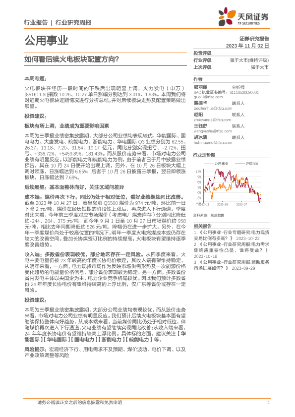 【天风证券】【20231102】公用事业行业研究周报:如何看后续火电板块配置方向?-13页