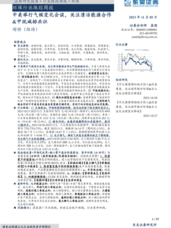 【东吴证券】【20231105】环保行业跟踪周报:中美举行气候变化会谈,关注清洁能源合作&甲烷减排共识-37页