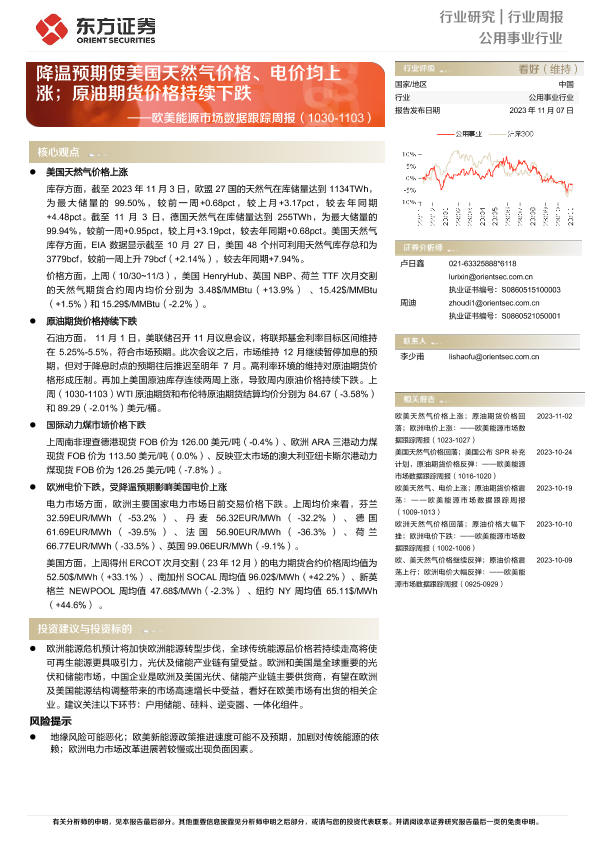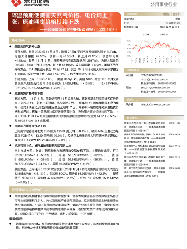 【东方证券】【20231107】欧美能源市场数据跟踪周报:降温预期使美国天然气价格、电价均上涨;原油期货价格持续下跌-13页
