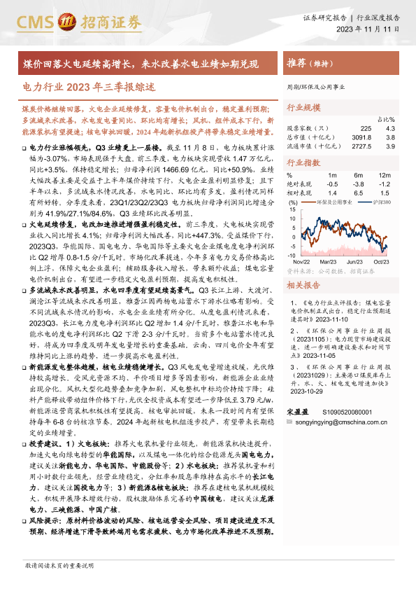 三季报 新能源 水电业绩 火电修复 电力行业